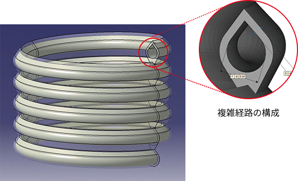 薄肉の水冷冷却経路で高効率な冷却を可能とします。内部経路をサポート材無しで造形する形状のご提案。